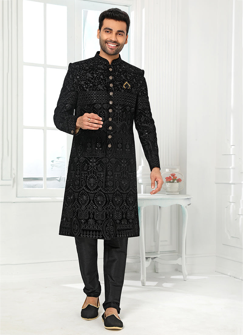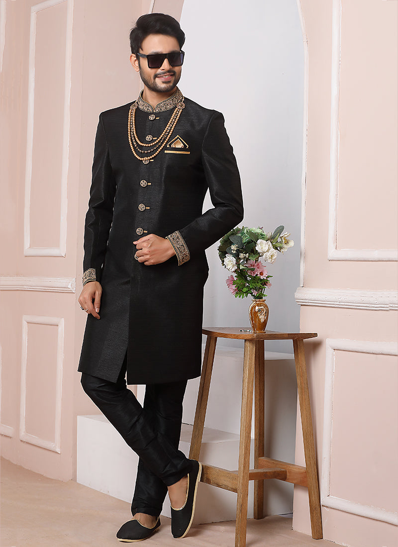 Black Art Banarasi Silk Wedding Wear Embroidery Work Sherwani