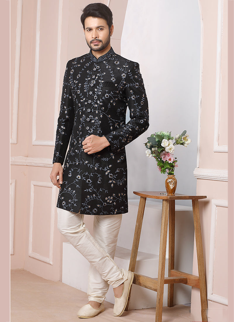 Black Art Silk Party Wear Thread Work Sherwani