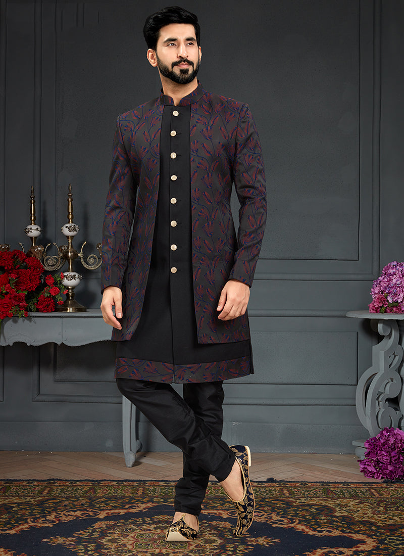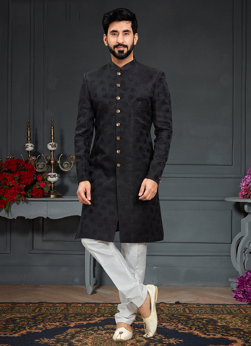 Black Jacquard Embroidery Work Reception Wear Sherwani Style