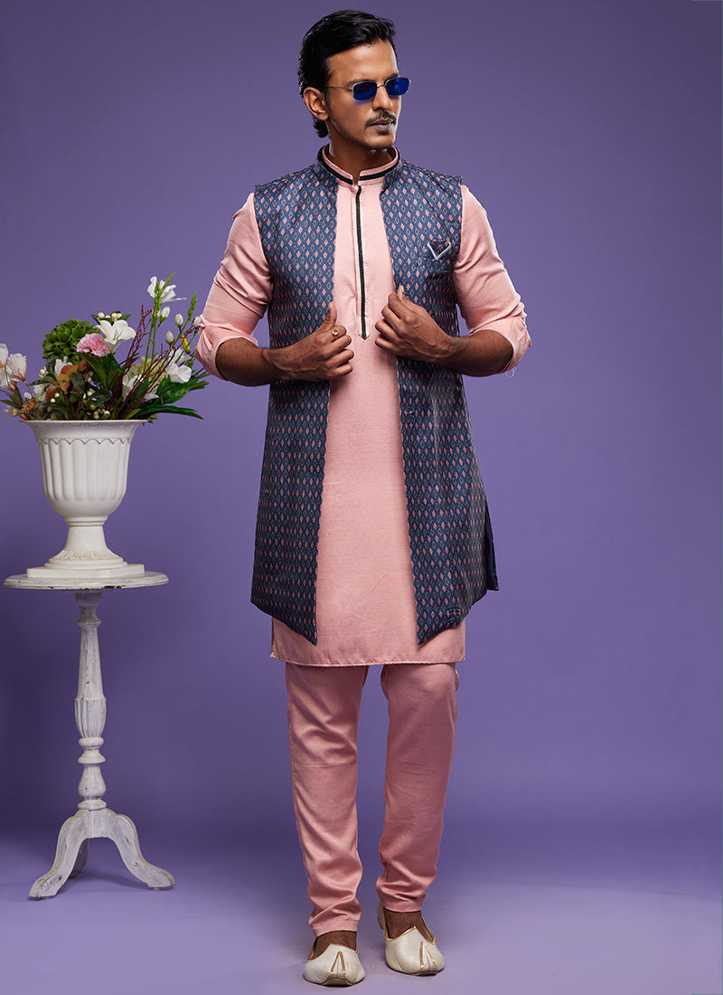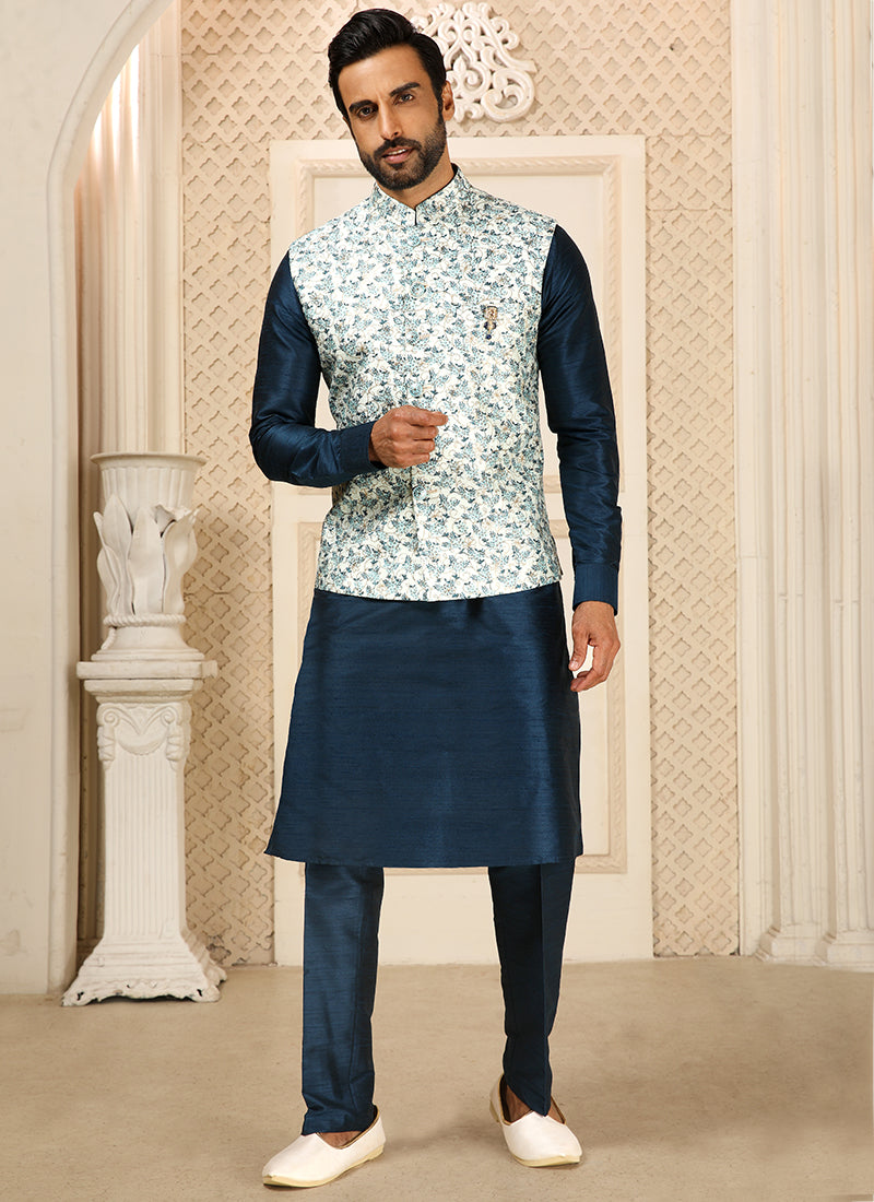 Blue Art Banarasi Silk Festival Wear Digital Printed Kurta Pajama With Jacket