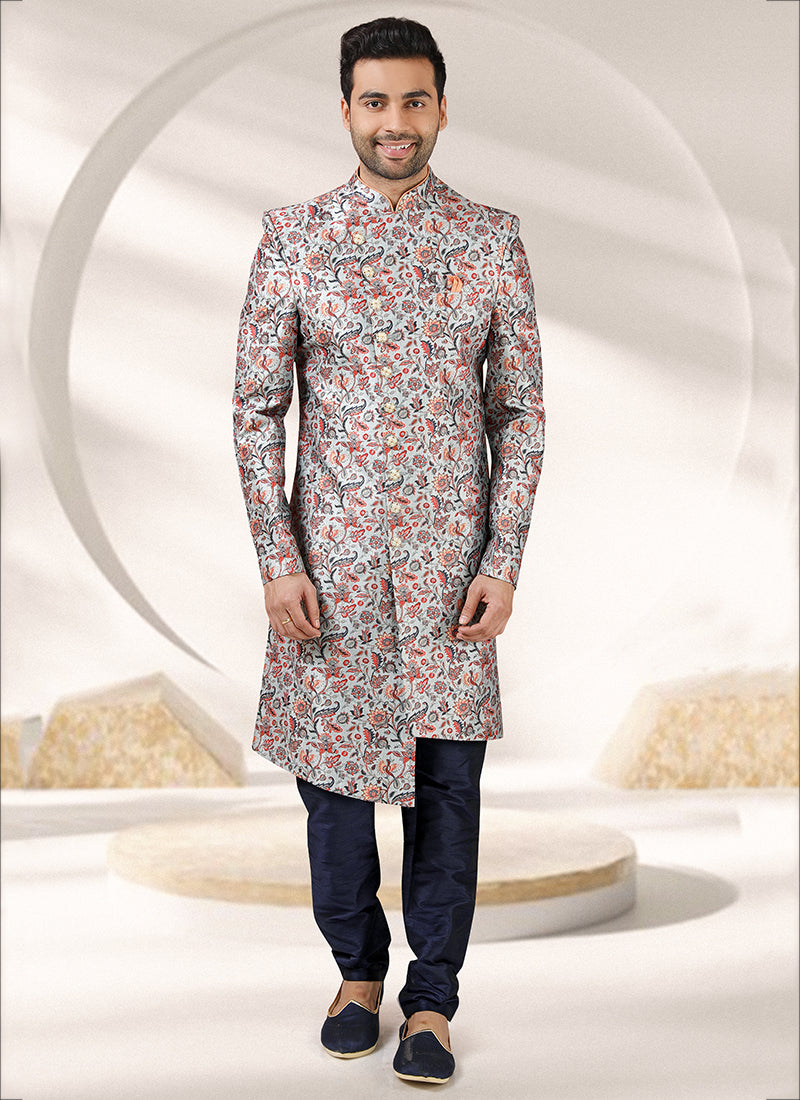 Blue Art Banarasi Silk Traditional Wear Printed Work Sherwani