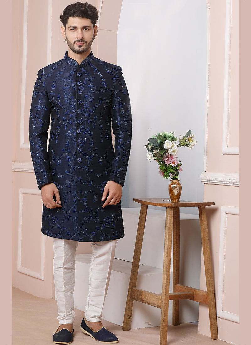 blue Art Silk Wedding Wear Thread Work Sherwani