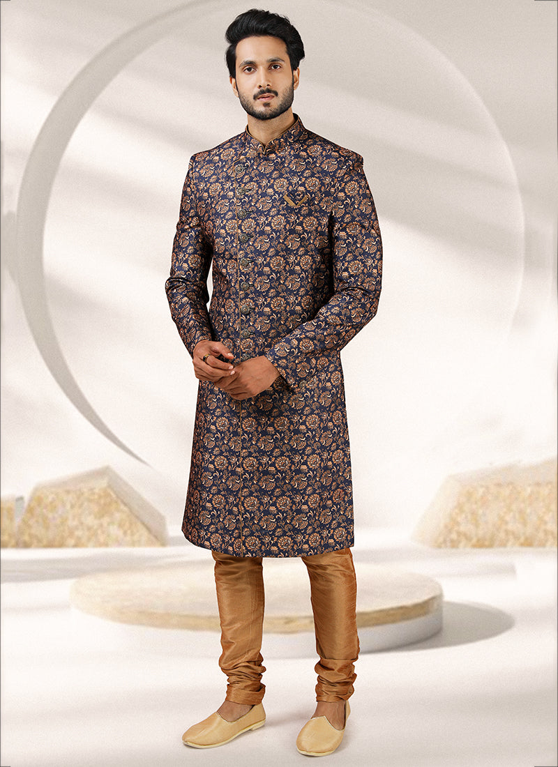Blue chikoo mix Art Banarasi Silk Traditional Wear Printed Work Sherwani