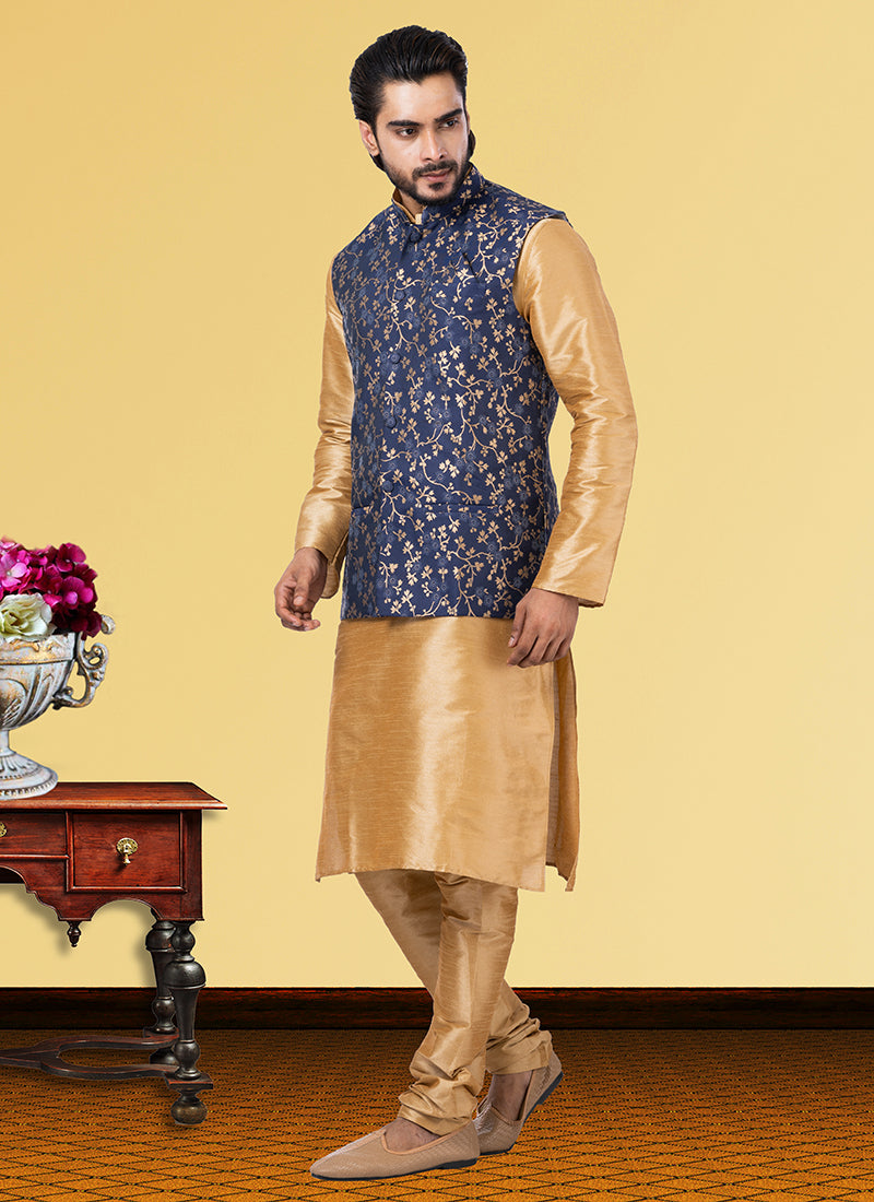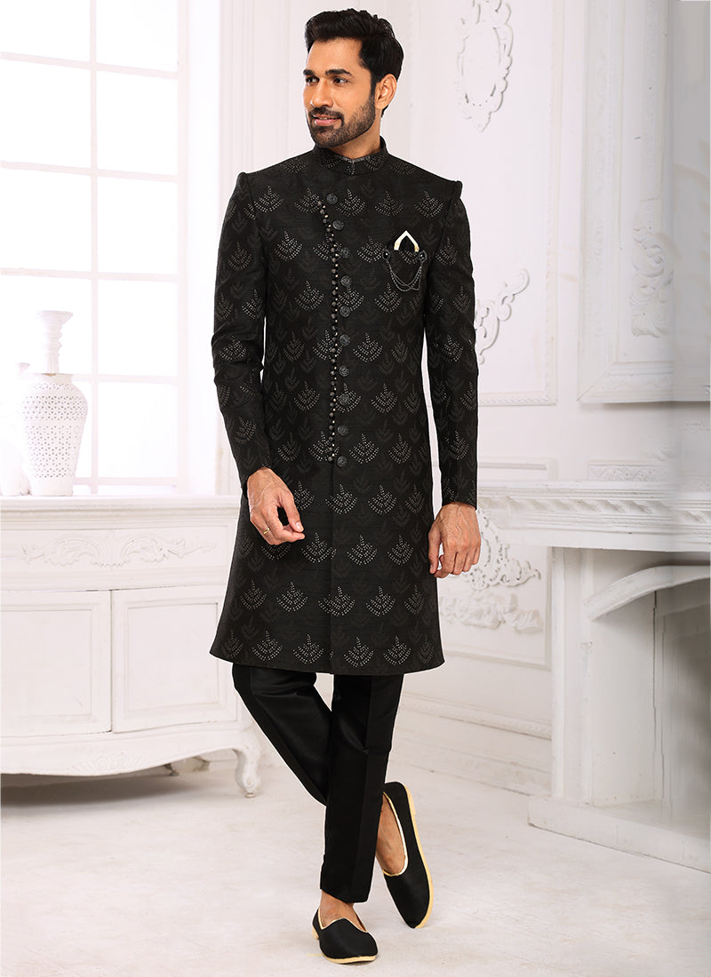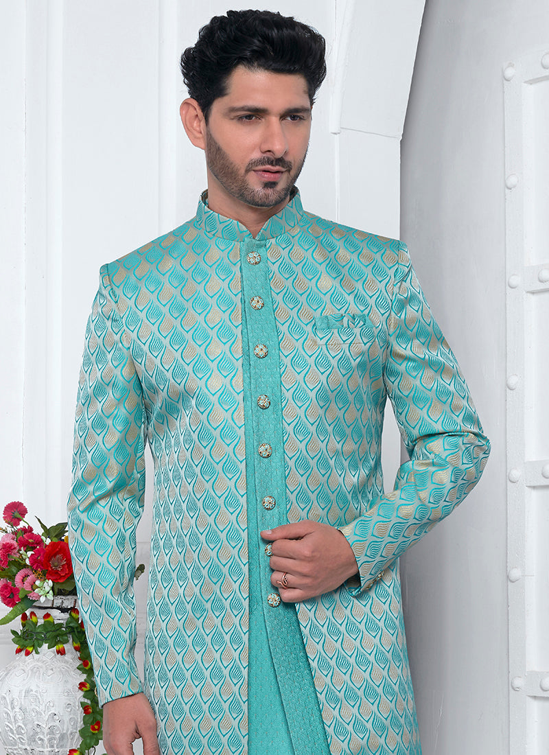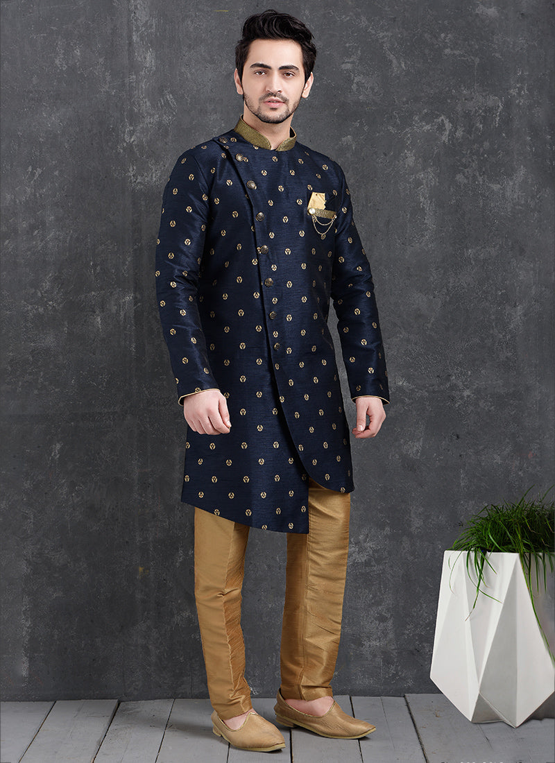 Blue Jaquard Silk Party Wear Pattern Pc Work Readymade Mens Indo Western