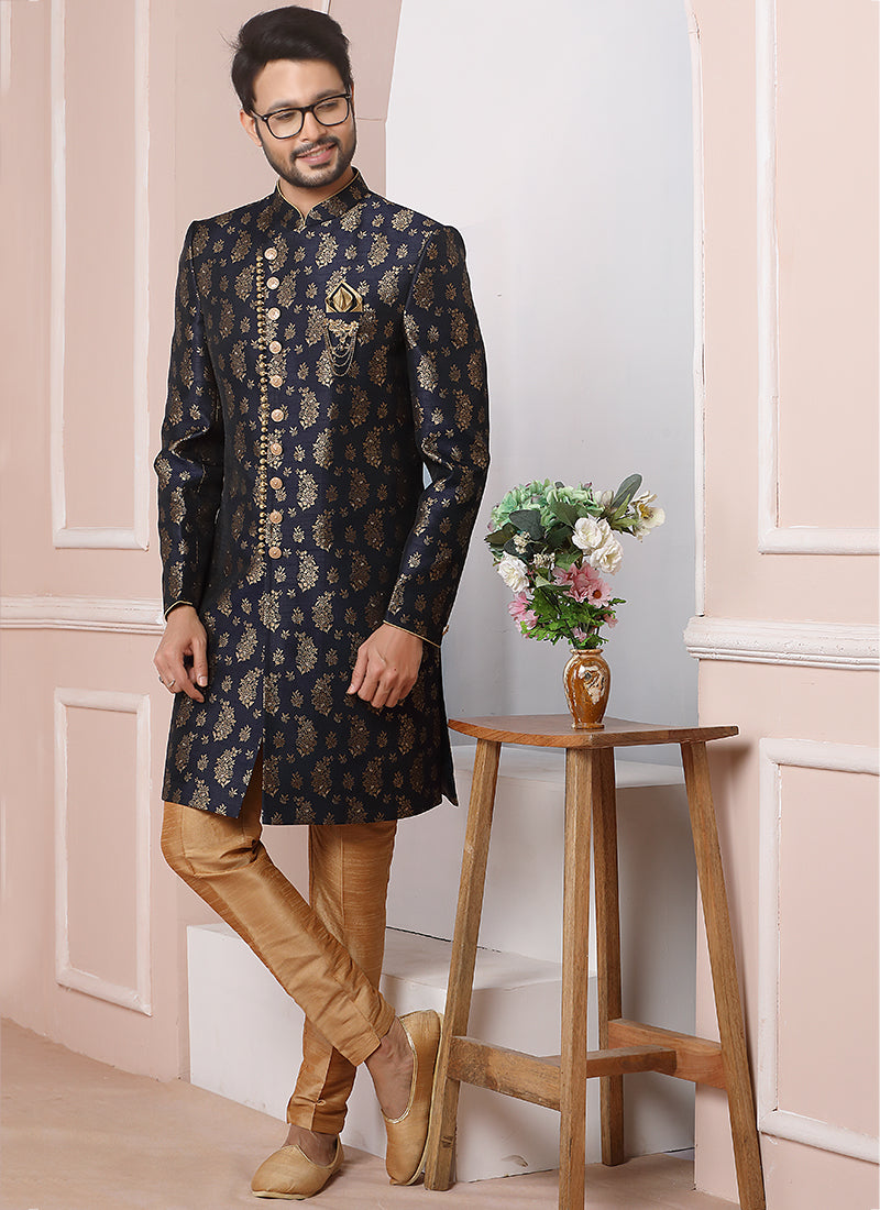 Blue Jacquard Brocade Silk Wedding Wear Embroidery Work Sherwani