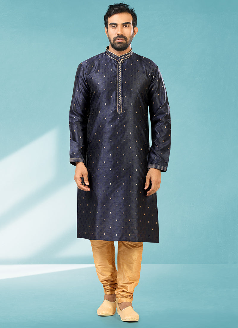 Blue Jacquard Brocade Silk Traditional Wear Thread Work Kurta Pajama