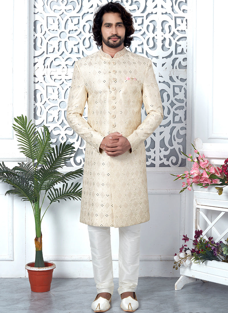 Art Silk Cream Wedding Wear Computer Thread Work Mens Sherwani