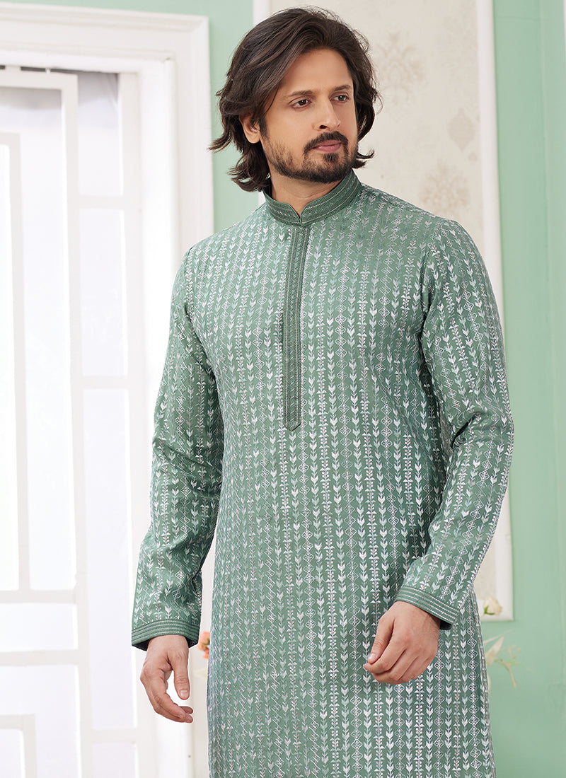 Art Silk Green Festival Wear Thread Work Readymade Kurta Pajama