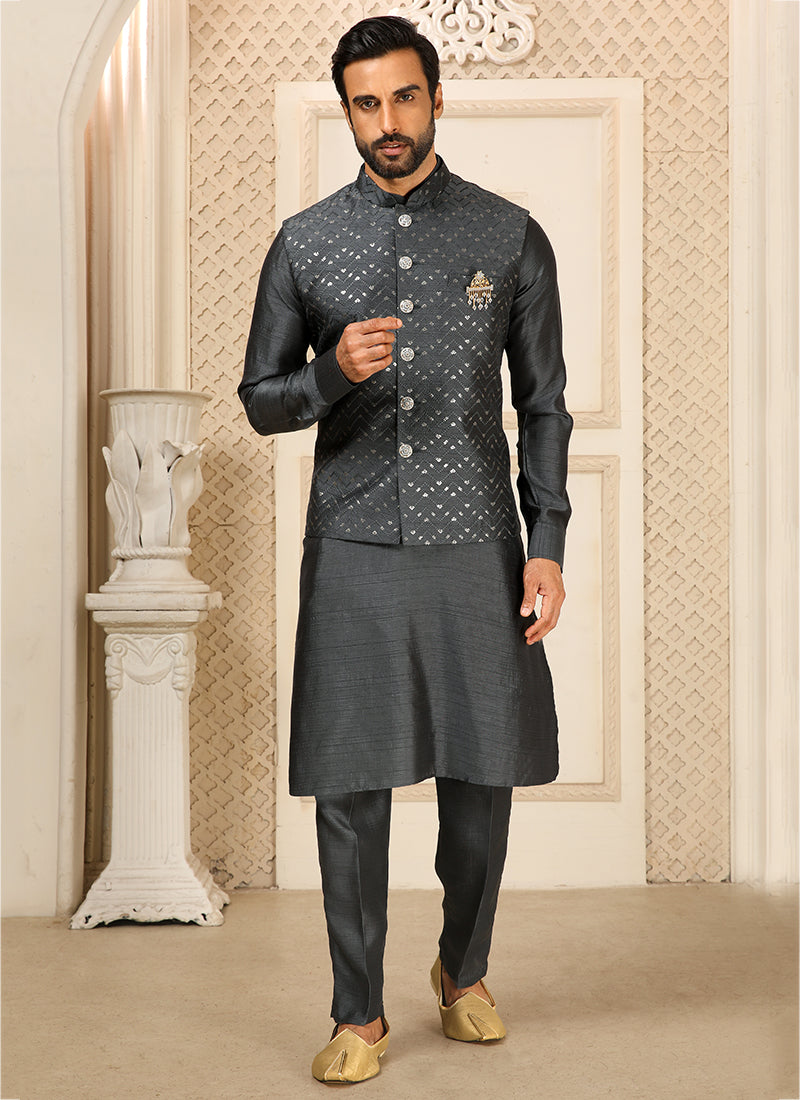 Dark Grey Art Banarasi Silk Reception Wear Embroidery Work Aligadhi 3 Pcs Jacket Set