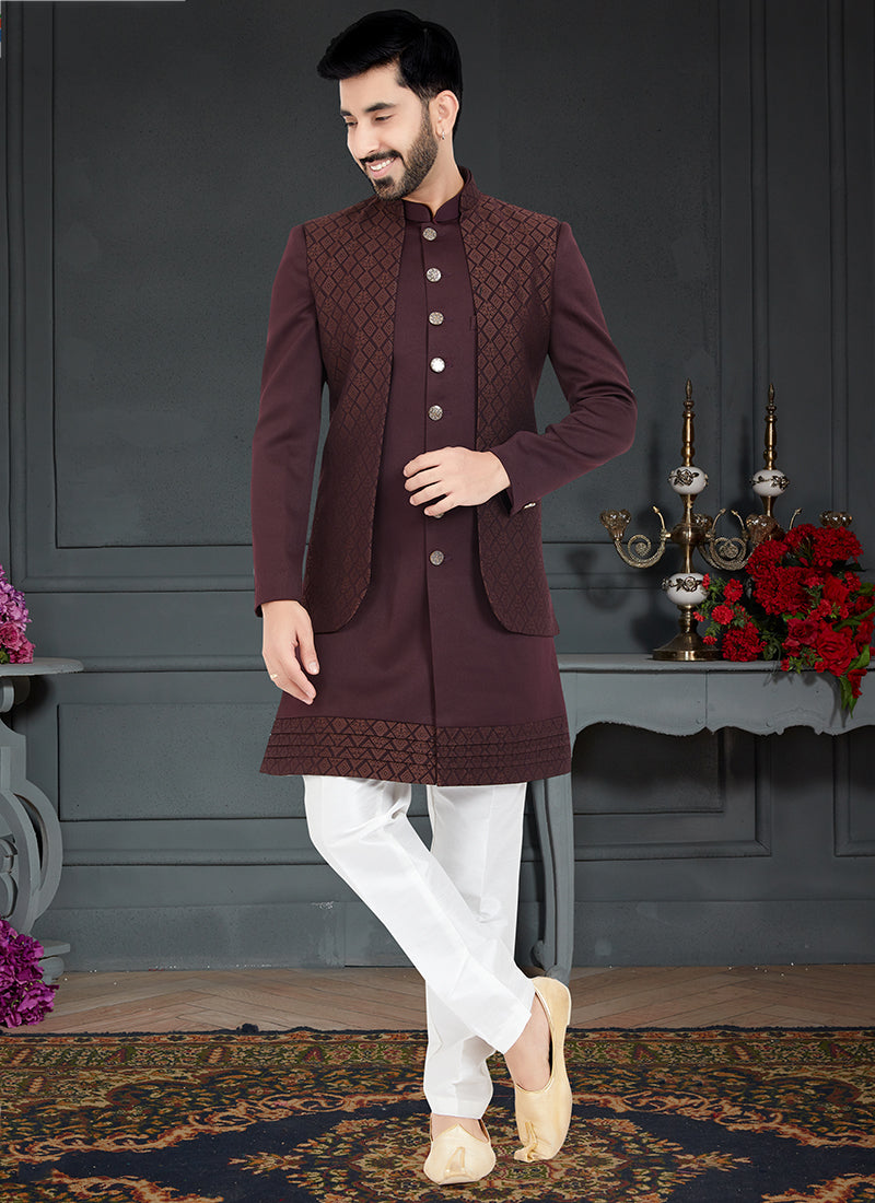 Dark Maroon Brown Soft Jecquard Traditional Wear Weaving Italian Indo Western