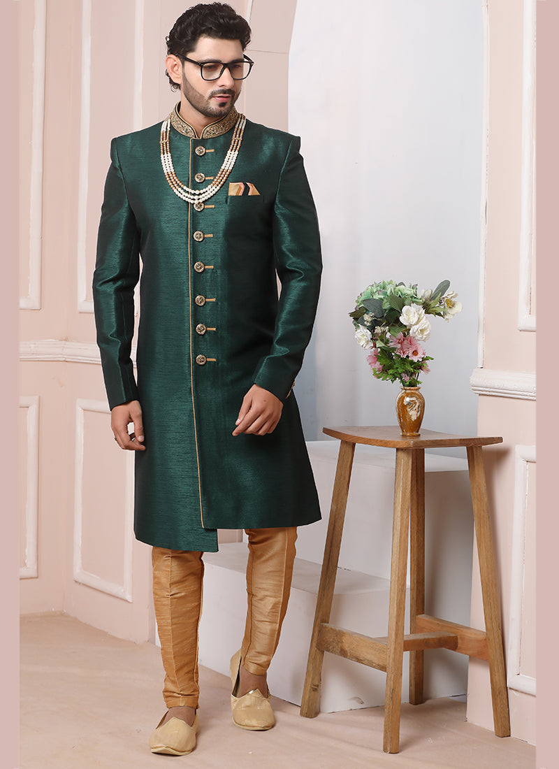 Dark green Brocade Jacquard Traditional Wear Weaving Nawabi Indo Western