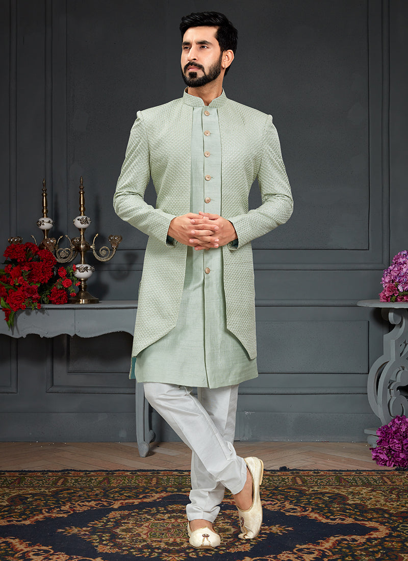 Dhupion Art Silk Pista Green Wedding Wear Thread Work Readymade Sherwani