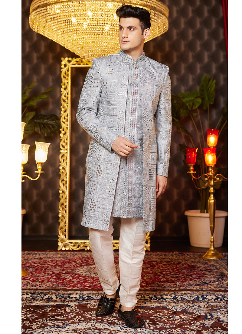 Art Silk Grey Wedding Wear Embroidery Work Readymade Groom Sherwani