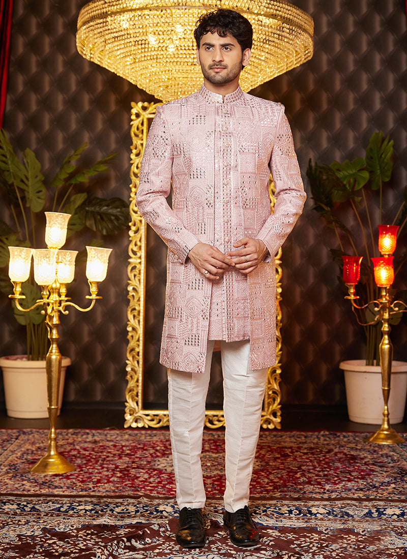 Art Silk Onion Pink Wedding Wear Thread Work Readymade Indo Western Sherwani