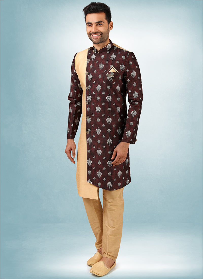 Art Silk Wine Wedding Wear Pattern Pc Readymade Sherwani