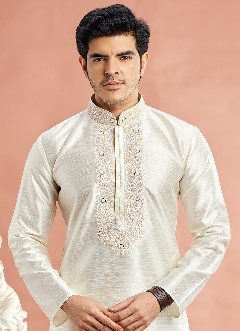 Banarasi Art Silk Cream Festival Wear Machine Work Readymade Kurta Pajama