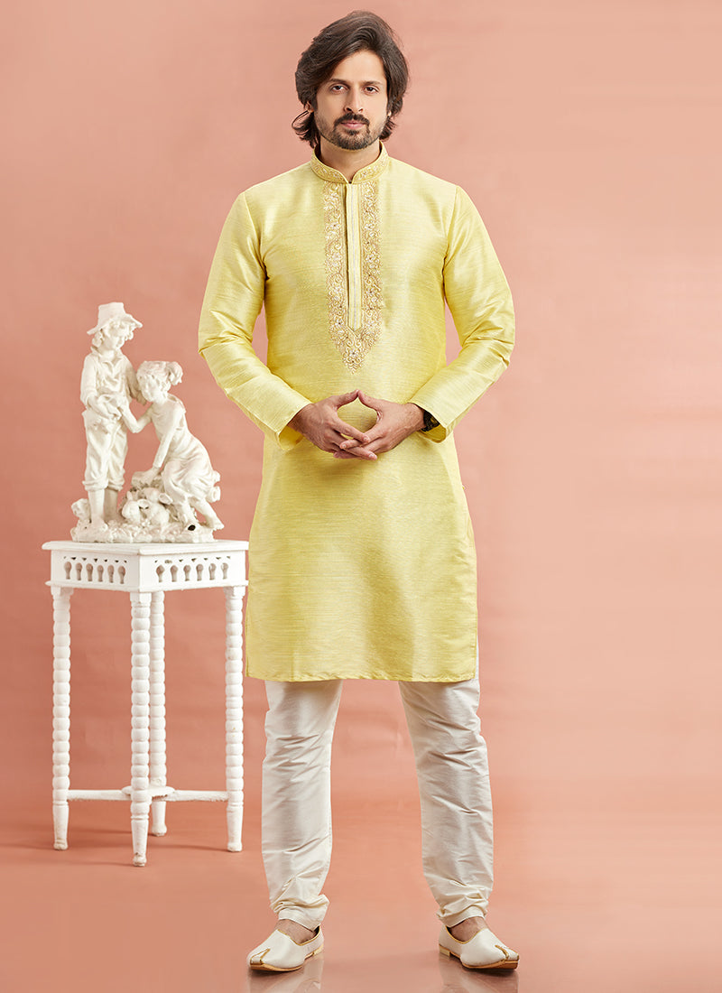 Banarasi Art Silk Yellow Festival Wear Machine Work Readymade Kurta Pajama