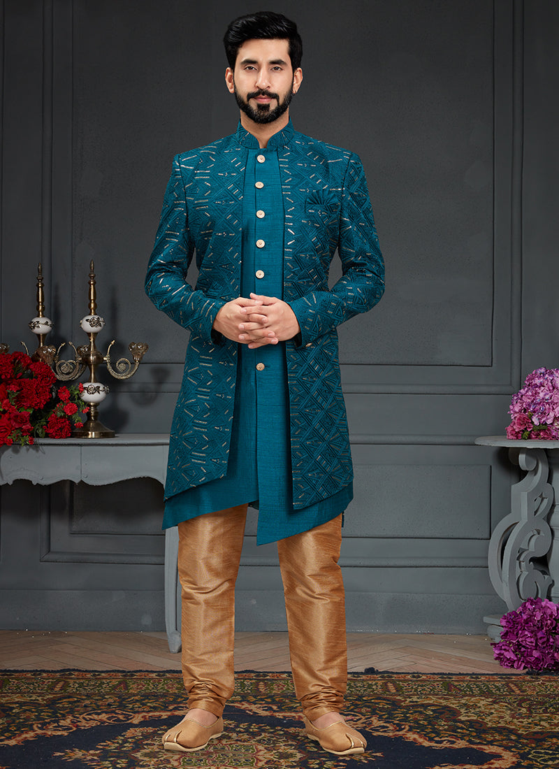 Peacock Blue Heavy Imported Silk Wedding Wear Weaving Italian Indo Western