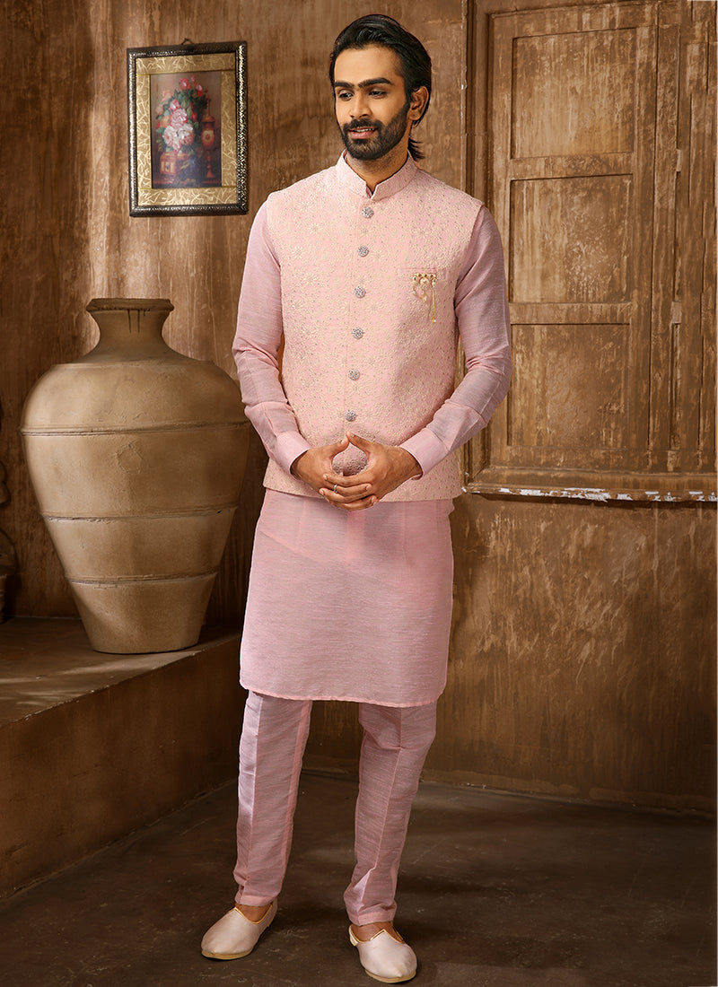 Pink Banarasi Silk Festival Wear Jacquard Kurta Pajama With Jacket