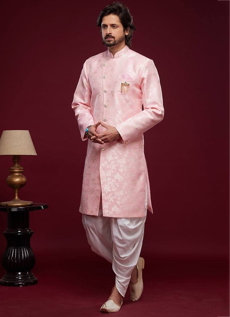 Pink Art Silk Wedding Wear Thread Work Indo Western Sherwani