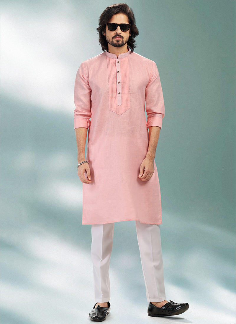 Pink Cotton Party Wear Thread Work Readymade Mens Kurta Pajama