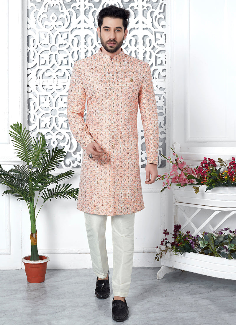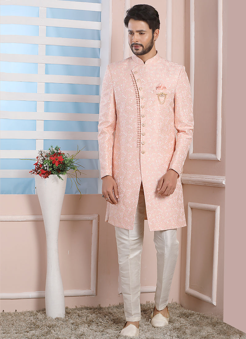 Pink Jaquard Silk Party Wear Pattern Pc Work Readymade Mens Indo Western