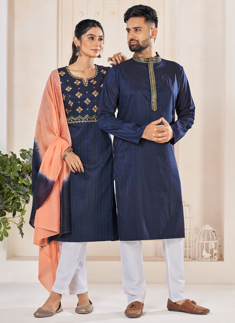 Pure Viscose Blue Festival Wear Embroidery Work Readymade Couple Combo Set