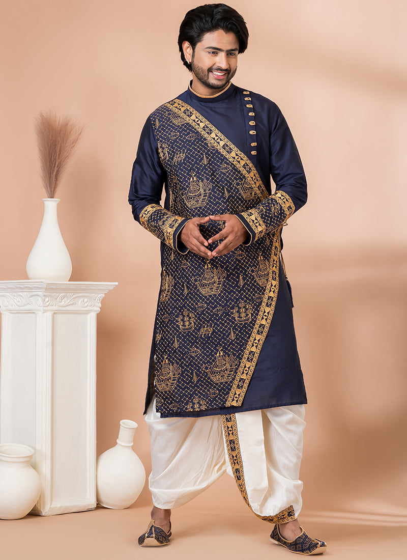Pure Viscose Navy Blue Traditional Wear Embroidery Work Dhoti Kurta