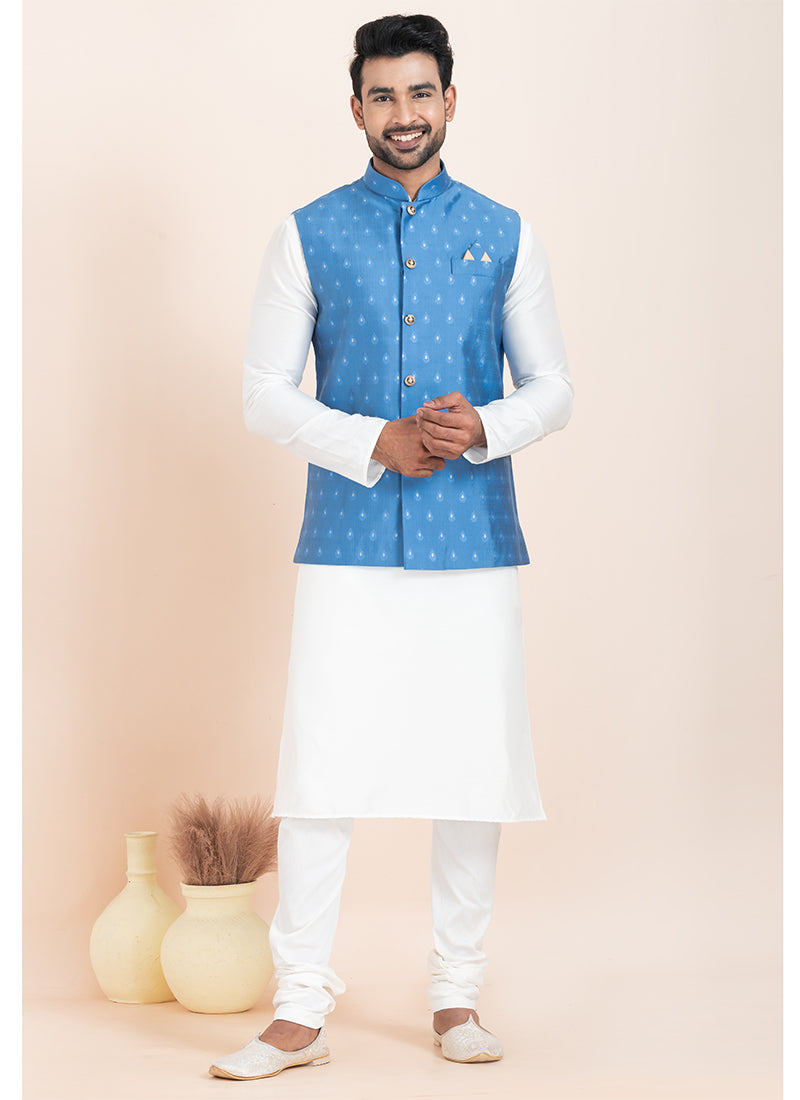 Banarasi Silk Blue Festival Wear Jacquard Work Readymade Modi Jacket Kurta Pajama