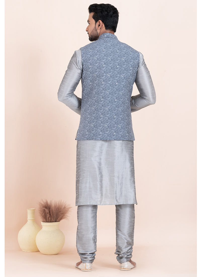 Banarasi Silk Grey Festival Wear Jacquard Work Readymade Modi Jacket Kurta Pajama