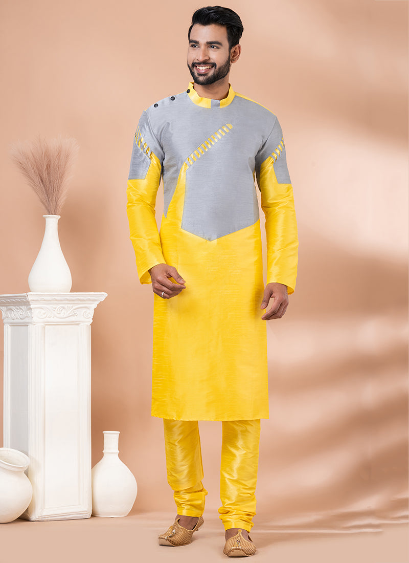 Banarasi Dhupion Silk Yellow Grey Festival Wear Weaving Kurta Pajama