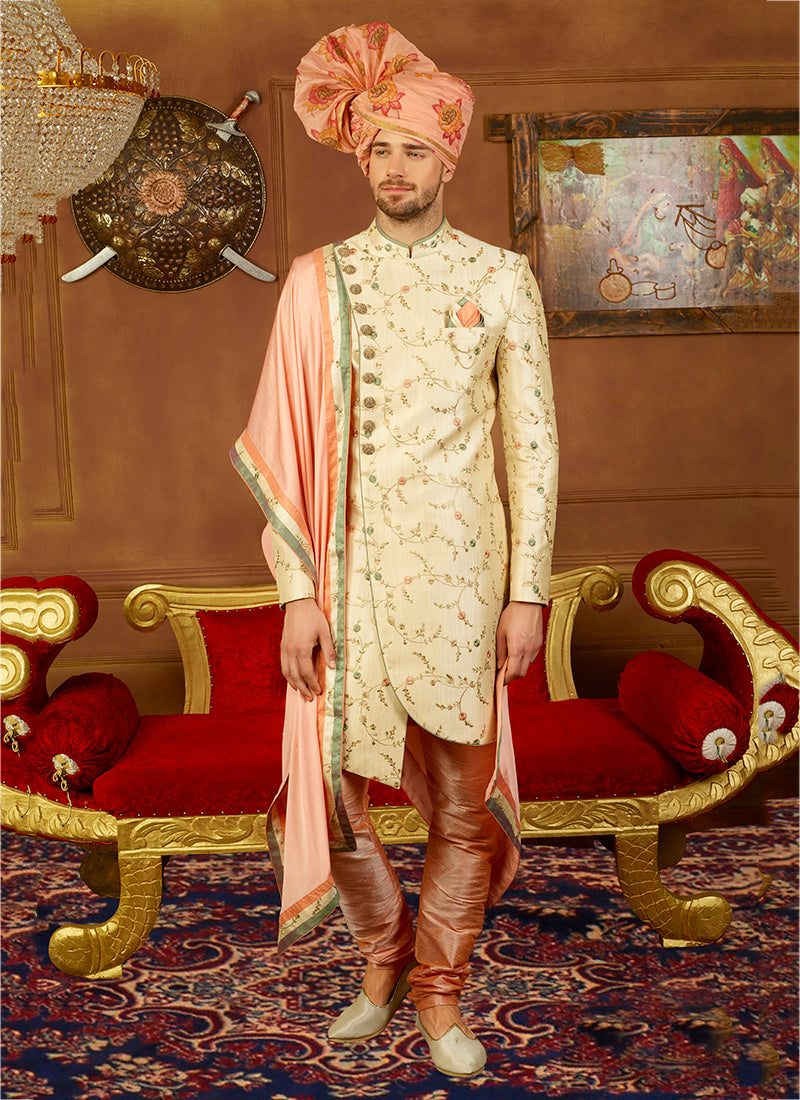 Banarasi Silk Party Wear Cream Embroidery Work Sherwani
