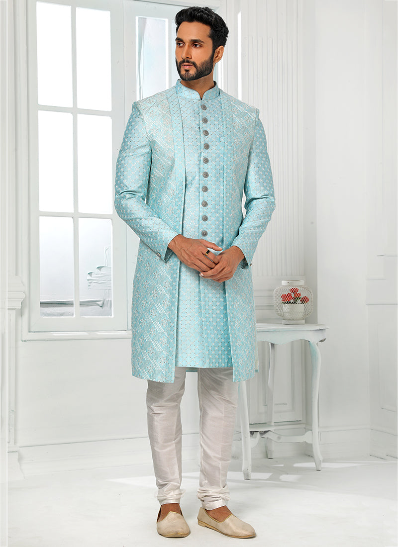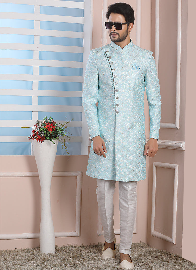 Silk Sky Blue Wedding Wear Computer Thread Readymade Sherwani Set