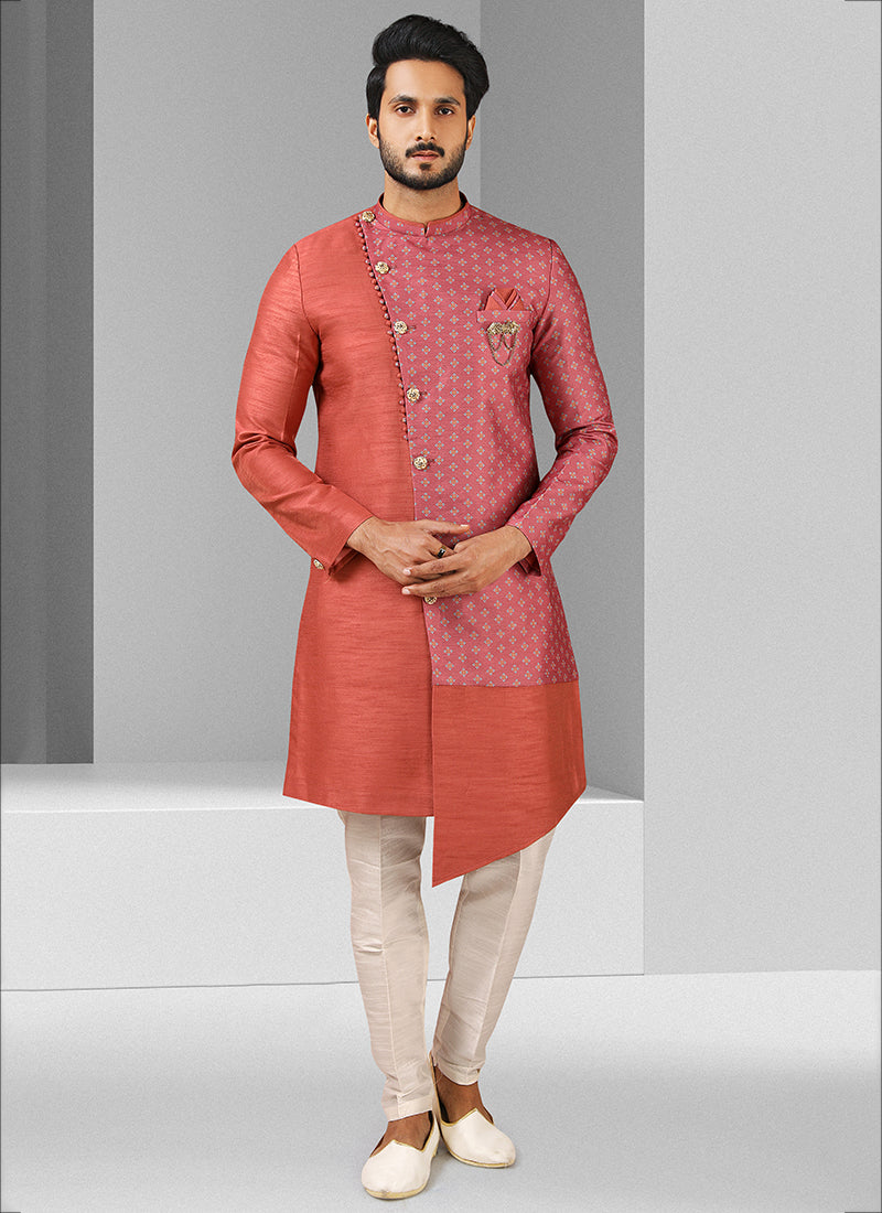 Silk Pink Wedding Wear Computer Thread Readymade Sherwani Set