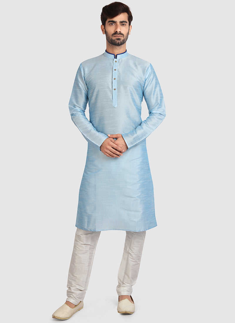 Sky Blue Art Silk Party Wear Thread Work Readymade Mens Kurta Pajama