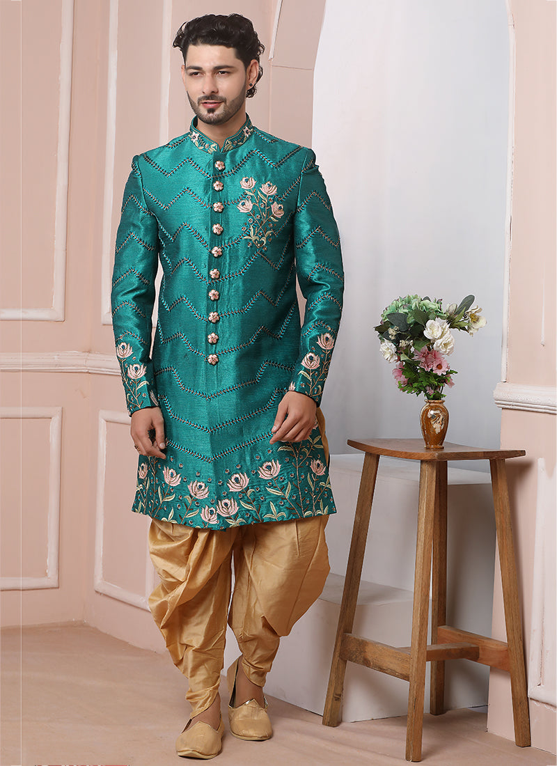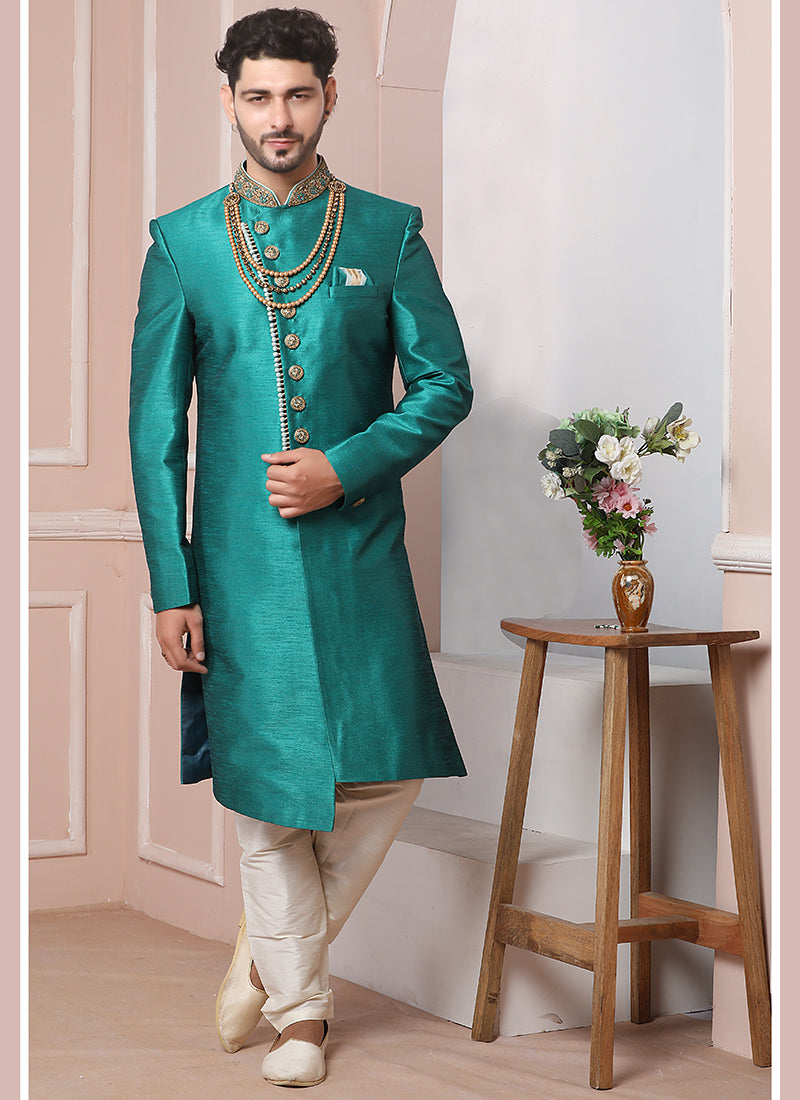 Teal Green Art Banarasi Silk Wedding Wear Embroidery Work Peshawari Sherwani