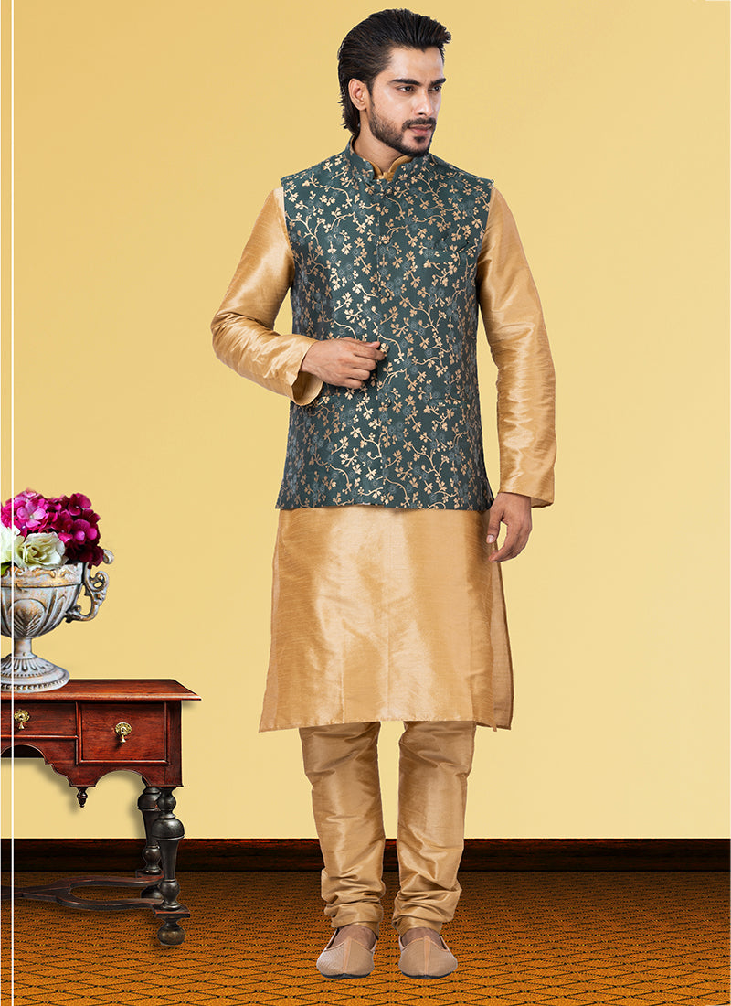 Teal Green Banarasi Silk Party Wear Jacquard Kurta Pajama With Jacket