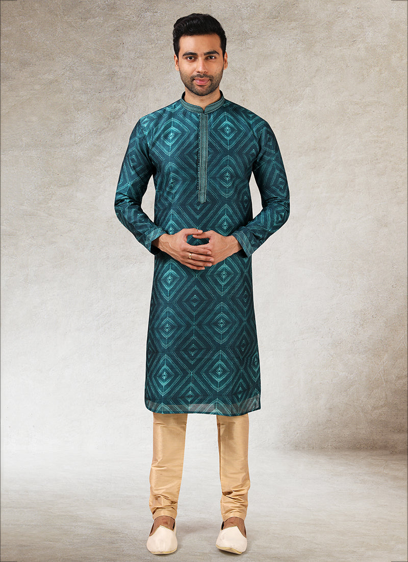 Teal green Art Silk Traditional Wear Printed Work Kurta Pajama
