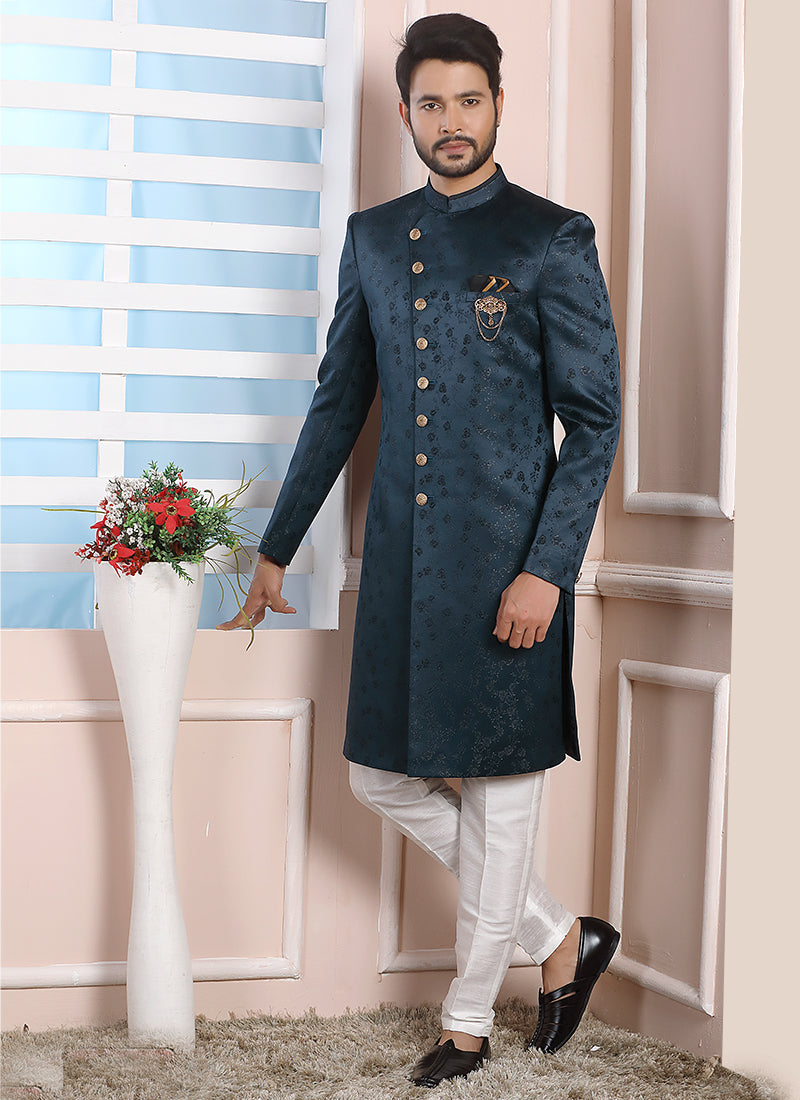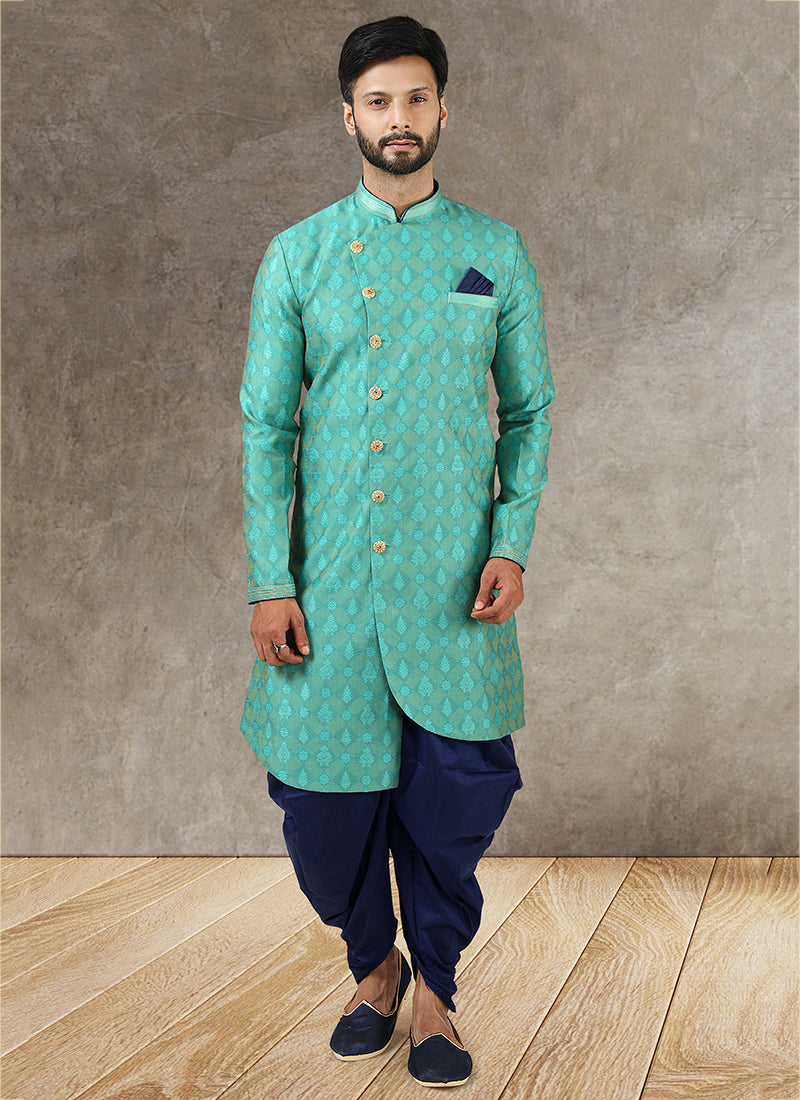 Teal green Imported jaquard silk Wedding Wear Weaving Aligadhi pant Indo Western