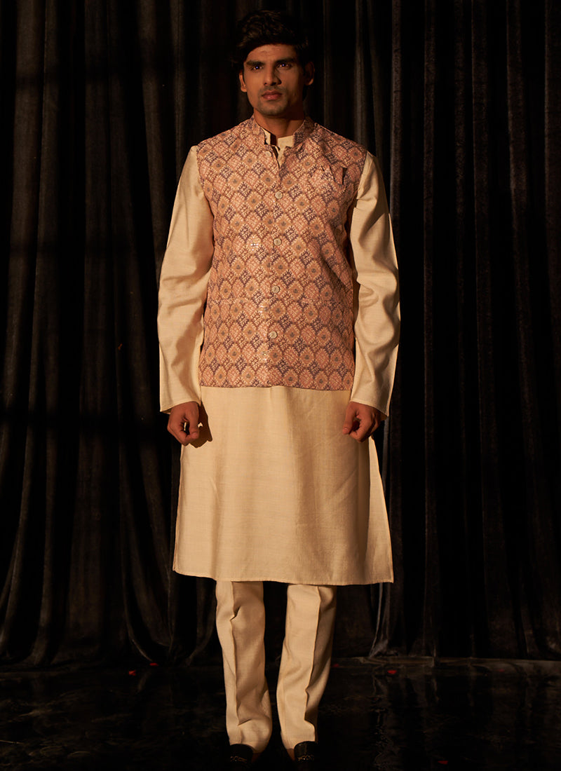 Viscose Beige Festival Wear Jacquard Work Readymade Kurta Pajama