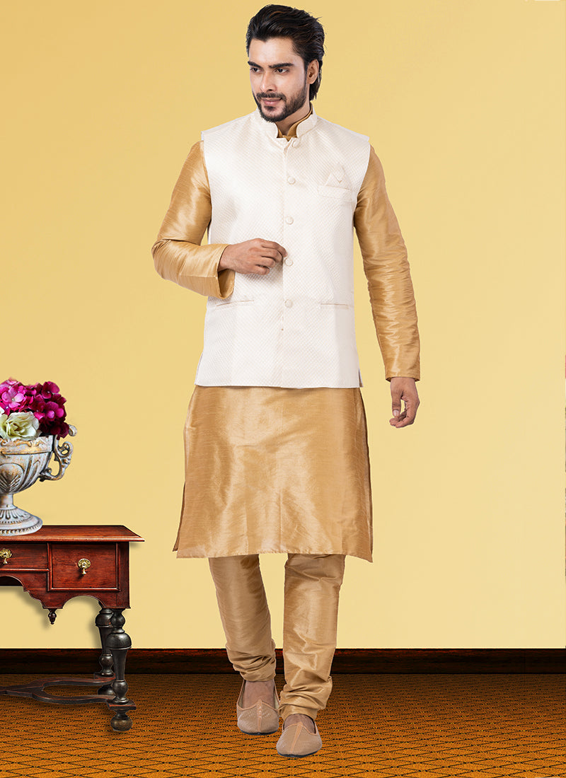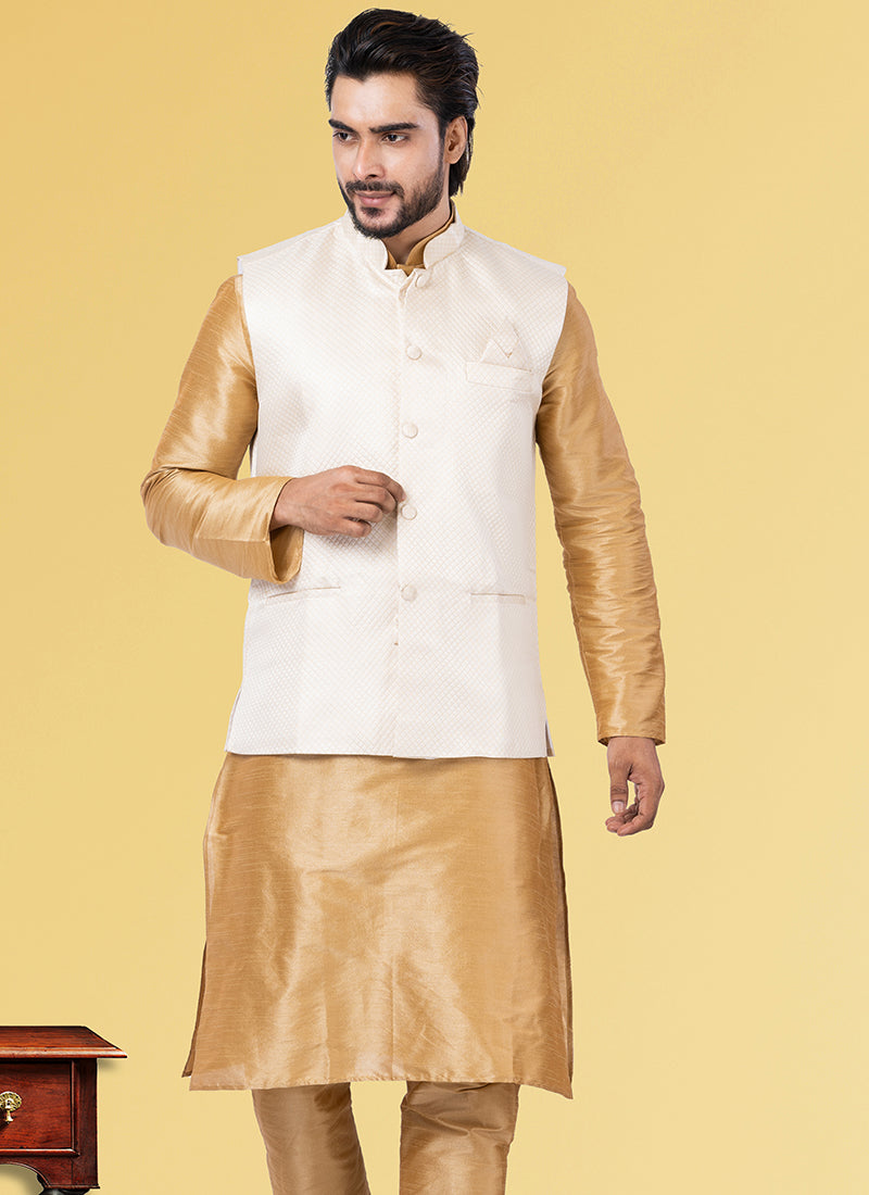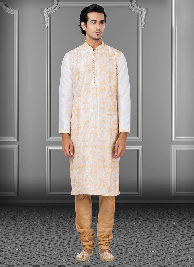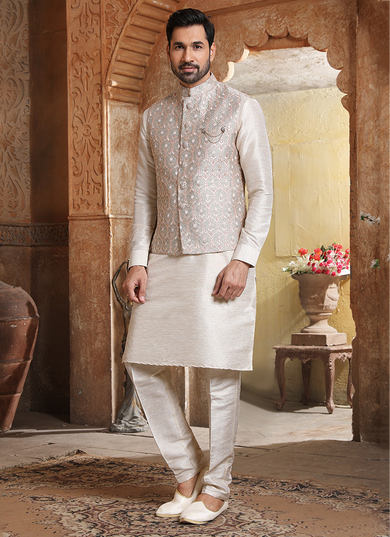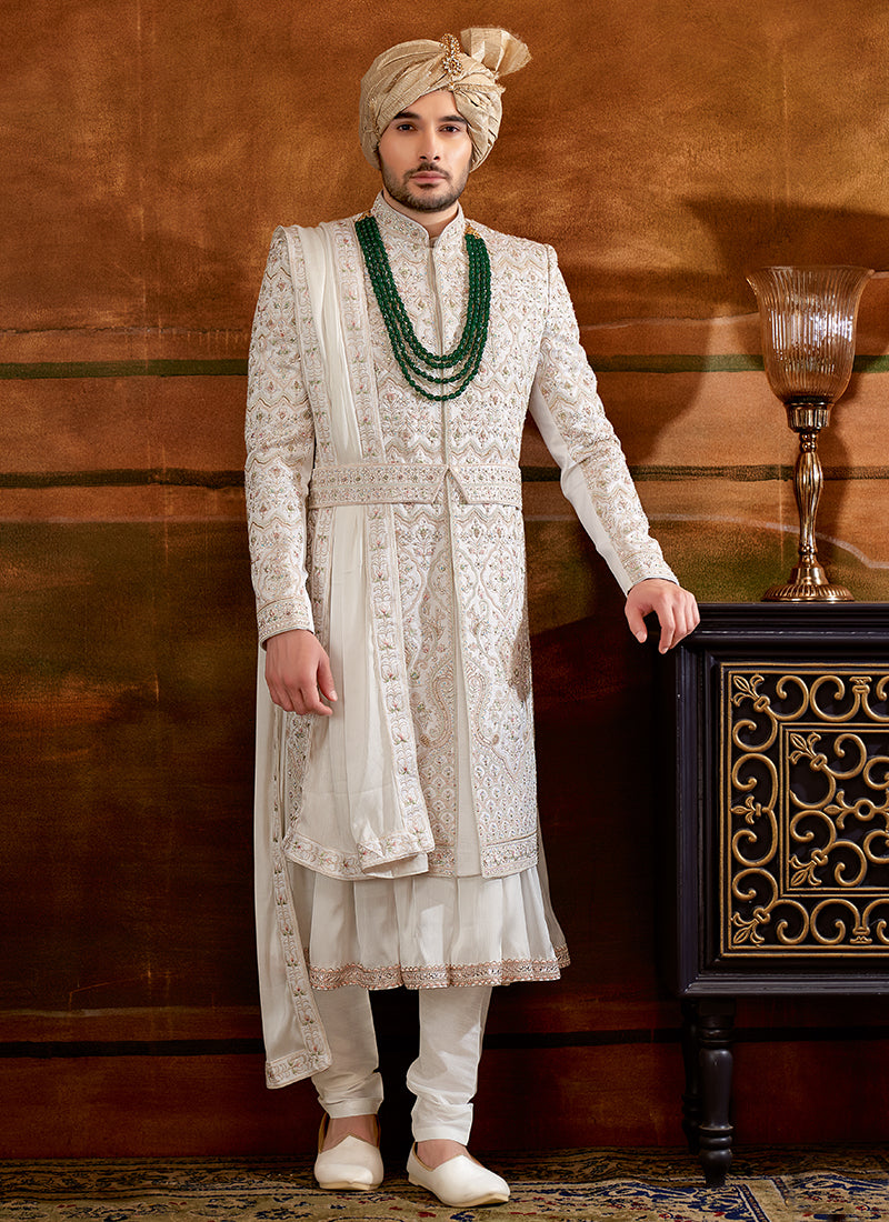 White Cream Jaquard Reception Wear Weaving Aligadhi 3 Pcs Jacket Set
