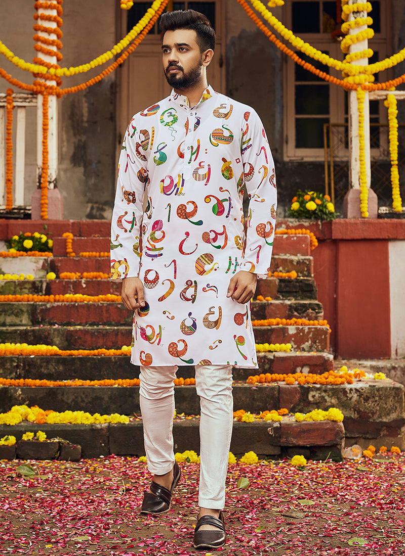 White Multi Color Silk Traditional Wear Digital Printed Kurta Pajama