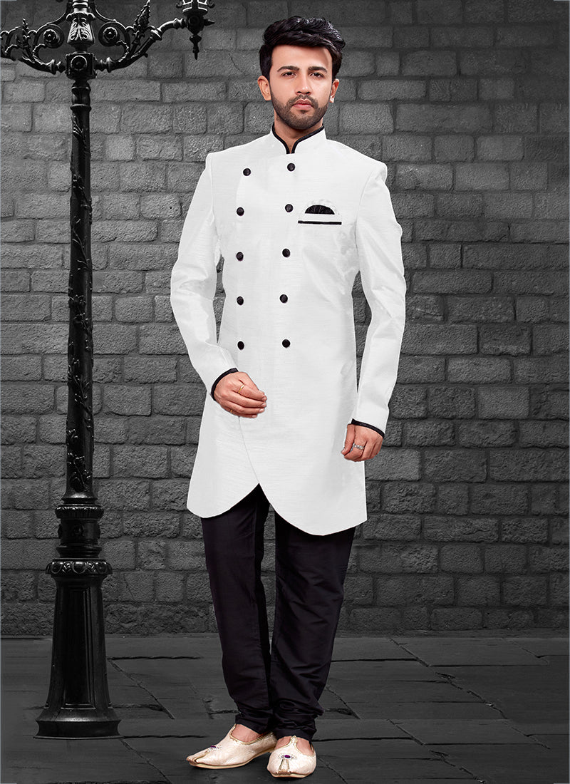 WHITE Art silk Wedding Wear Weaving Anarkali Sherwani