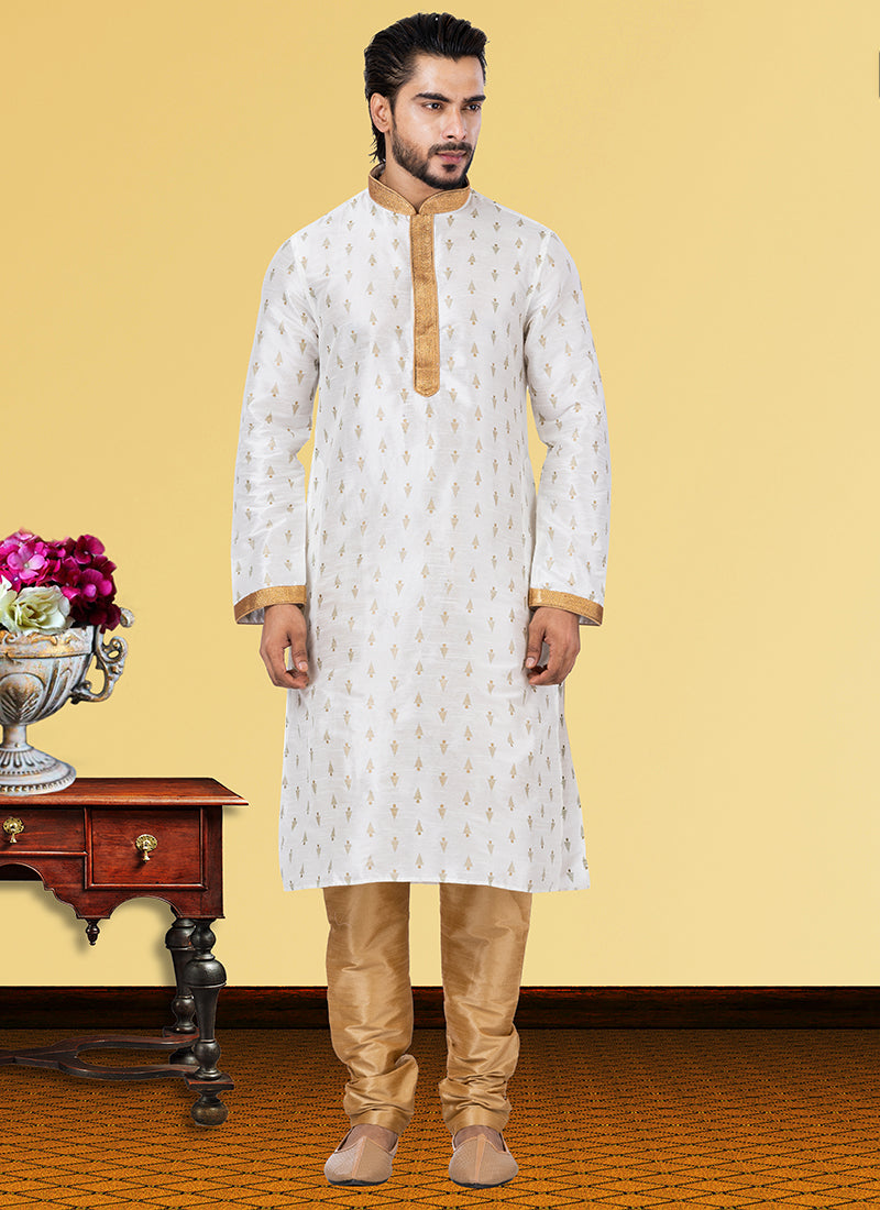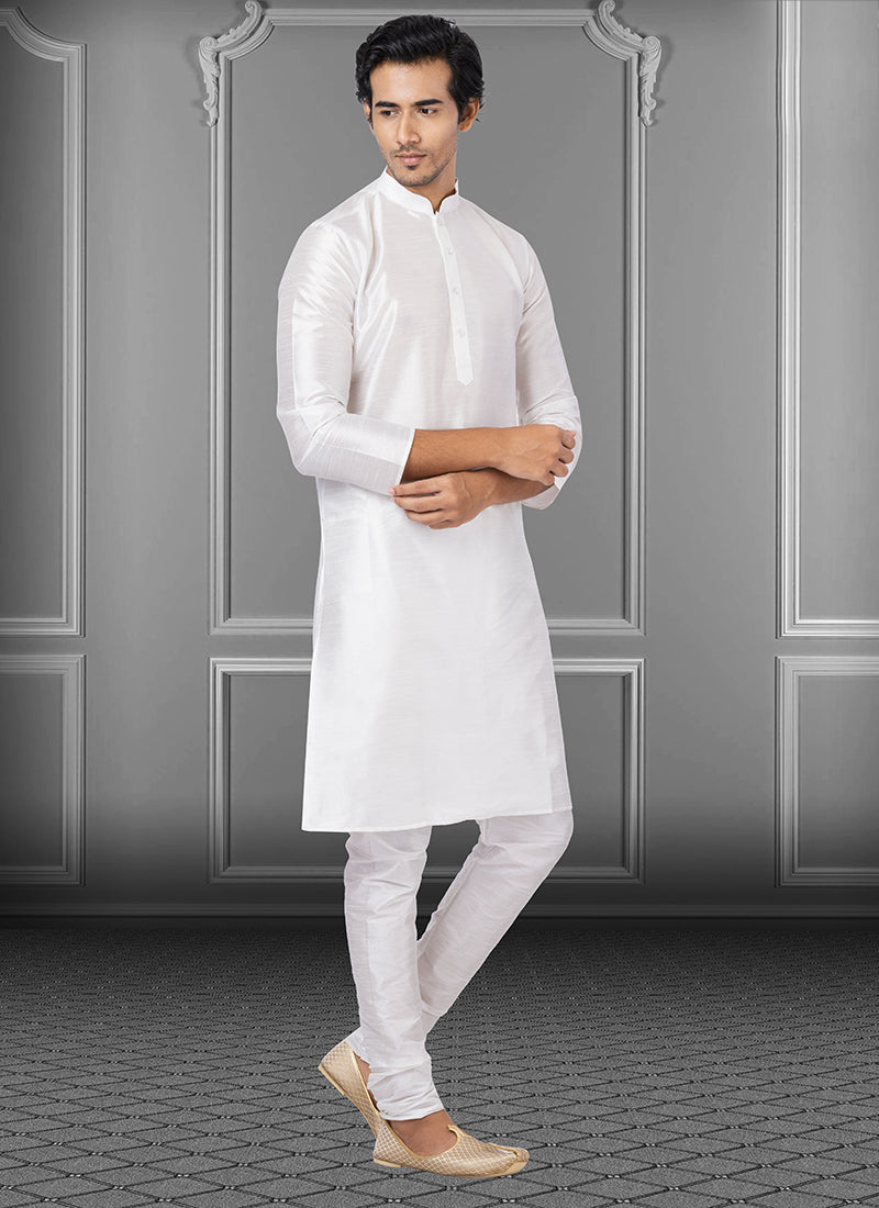 White Dhupion Raw Silk Festival Wear Weaving Kurta Pajama