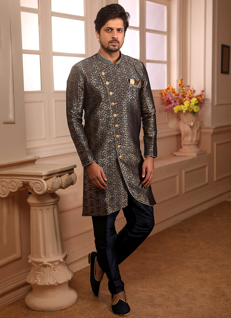 Wedding Wear Blue Jacqaurd Weaving Indowestern