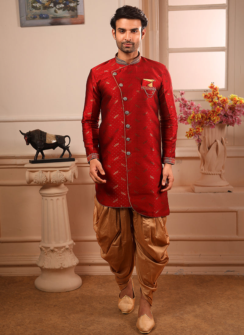 Wedding Wear Red Jacqaurd Weaving Indowestern
