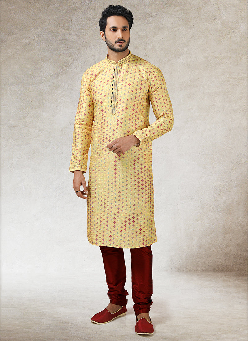 Yellow Art Silk Party Wear Thread Work Readymade Mens Kurta Pajama
