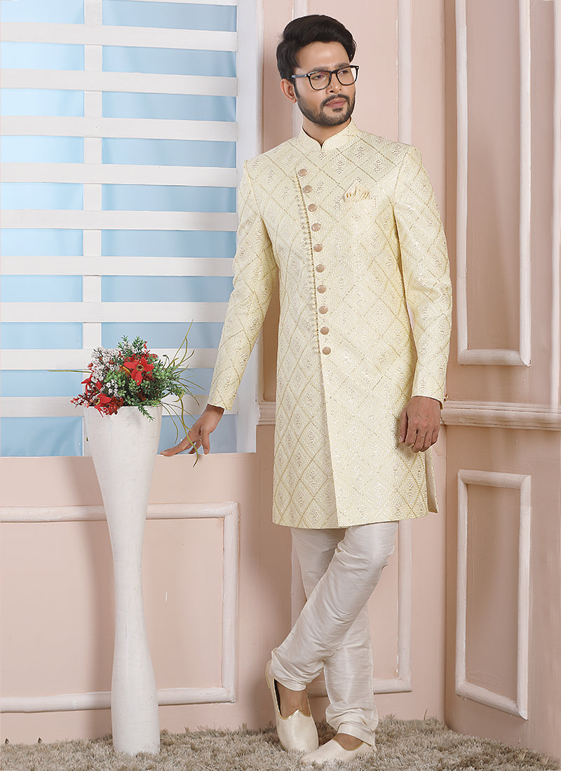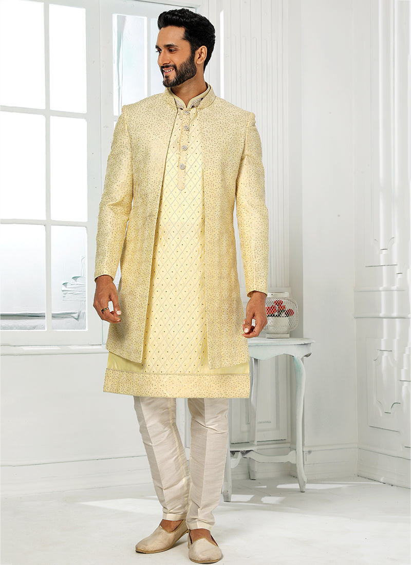 Yellow Art Silk Wedding Wear Thread Work Indo Western Sherwani