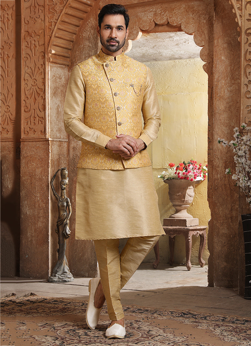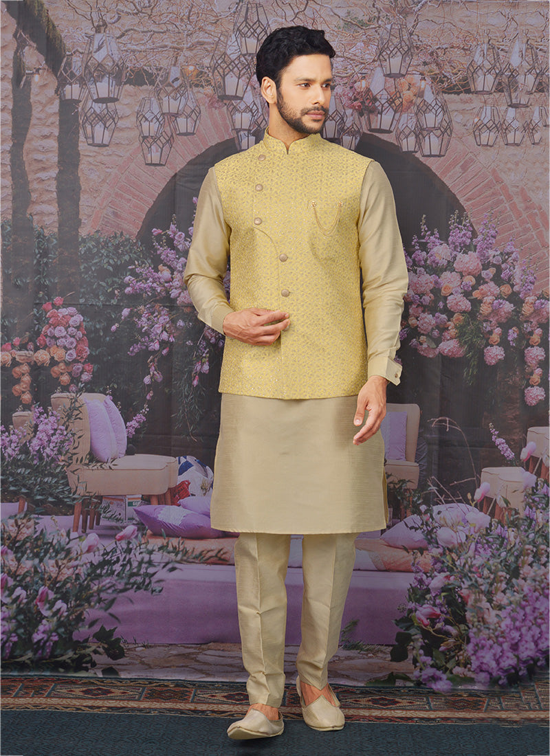 Yellow Banarasi Silk Traditional Wear Jacquard Kurta Pajama With Jacket