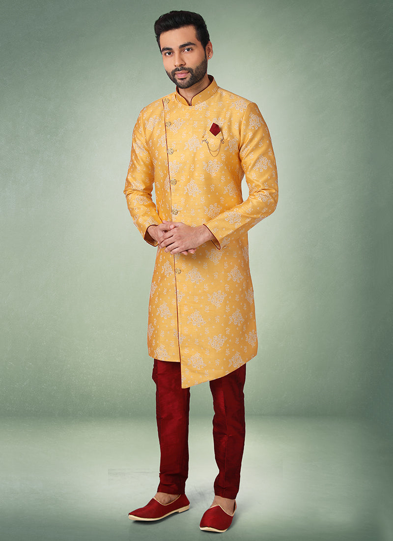 Yellow Banarasi Jacquard Wedding Wear Weaving Indo Western Sherwani